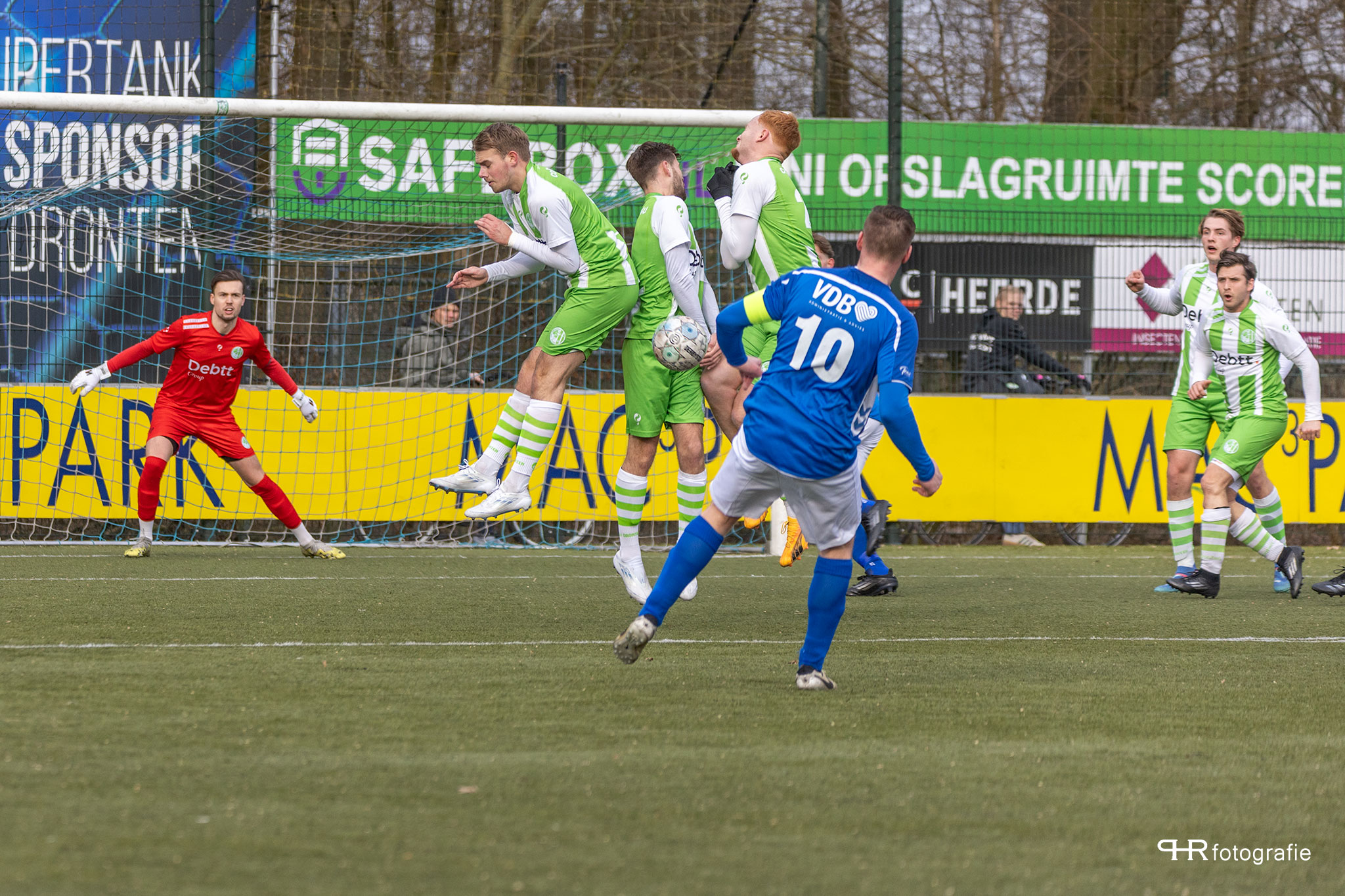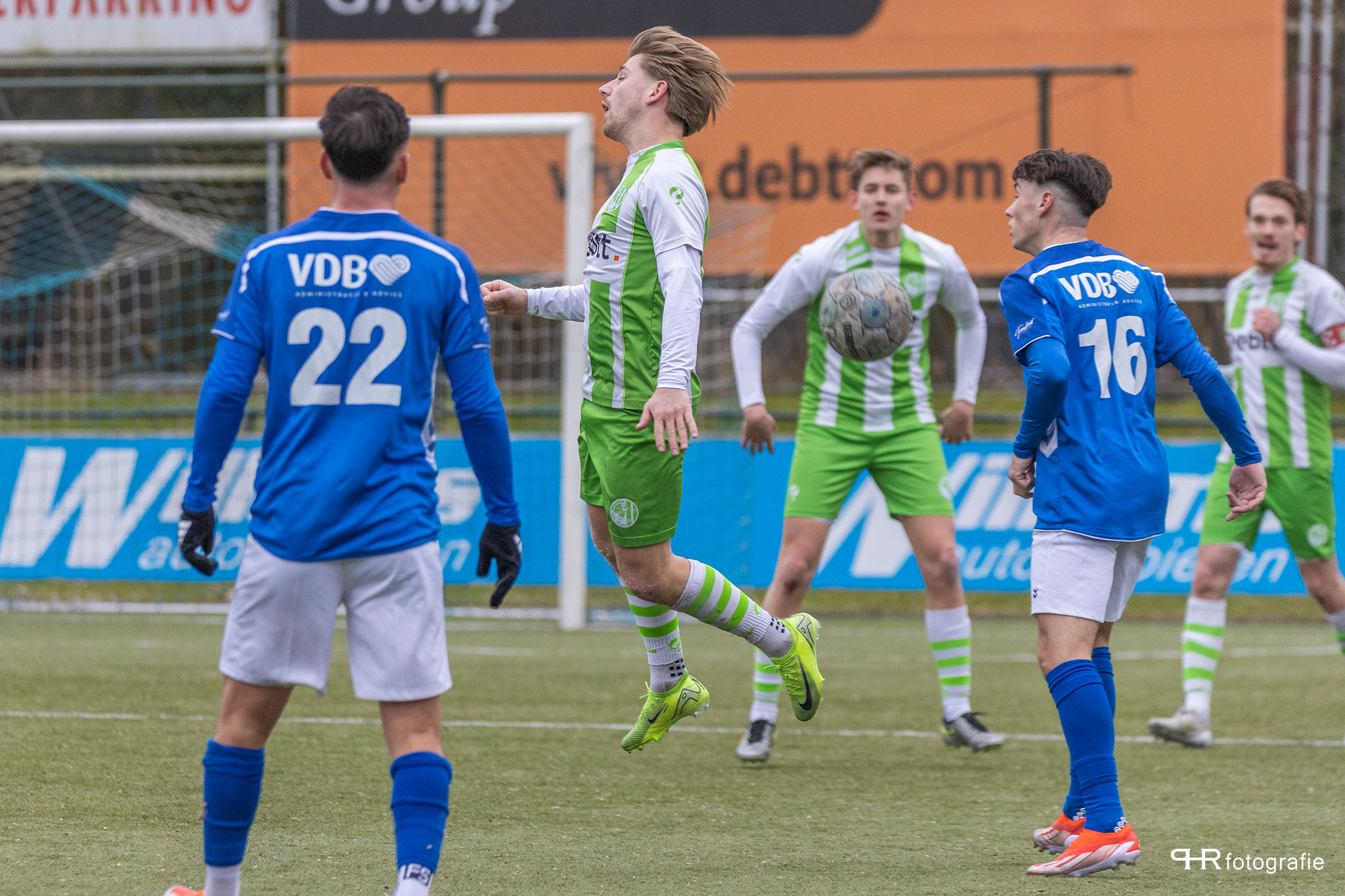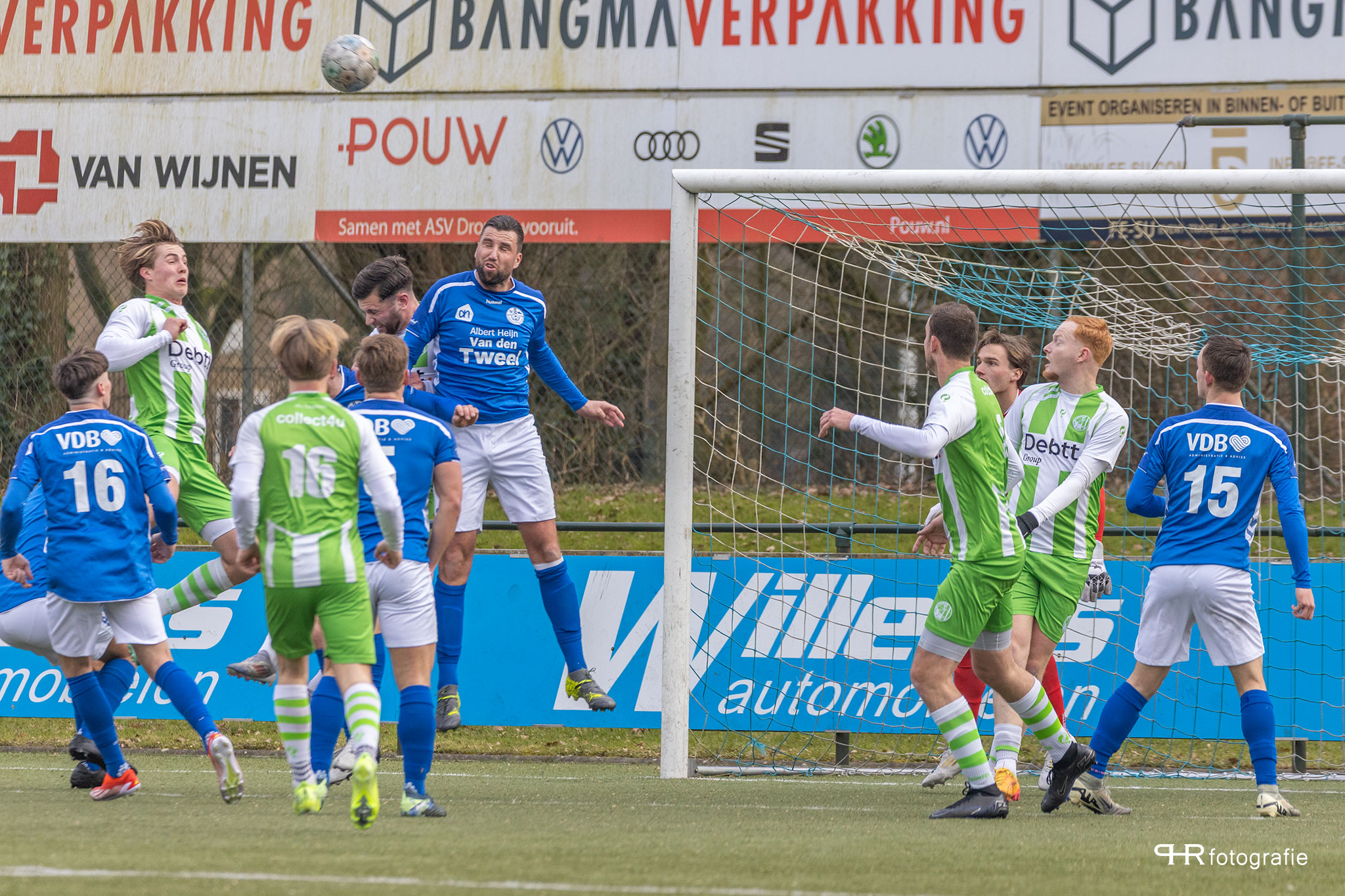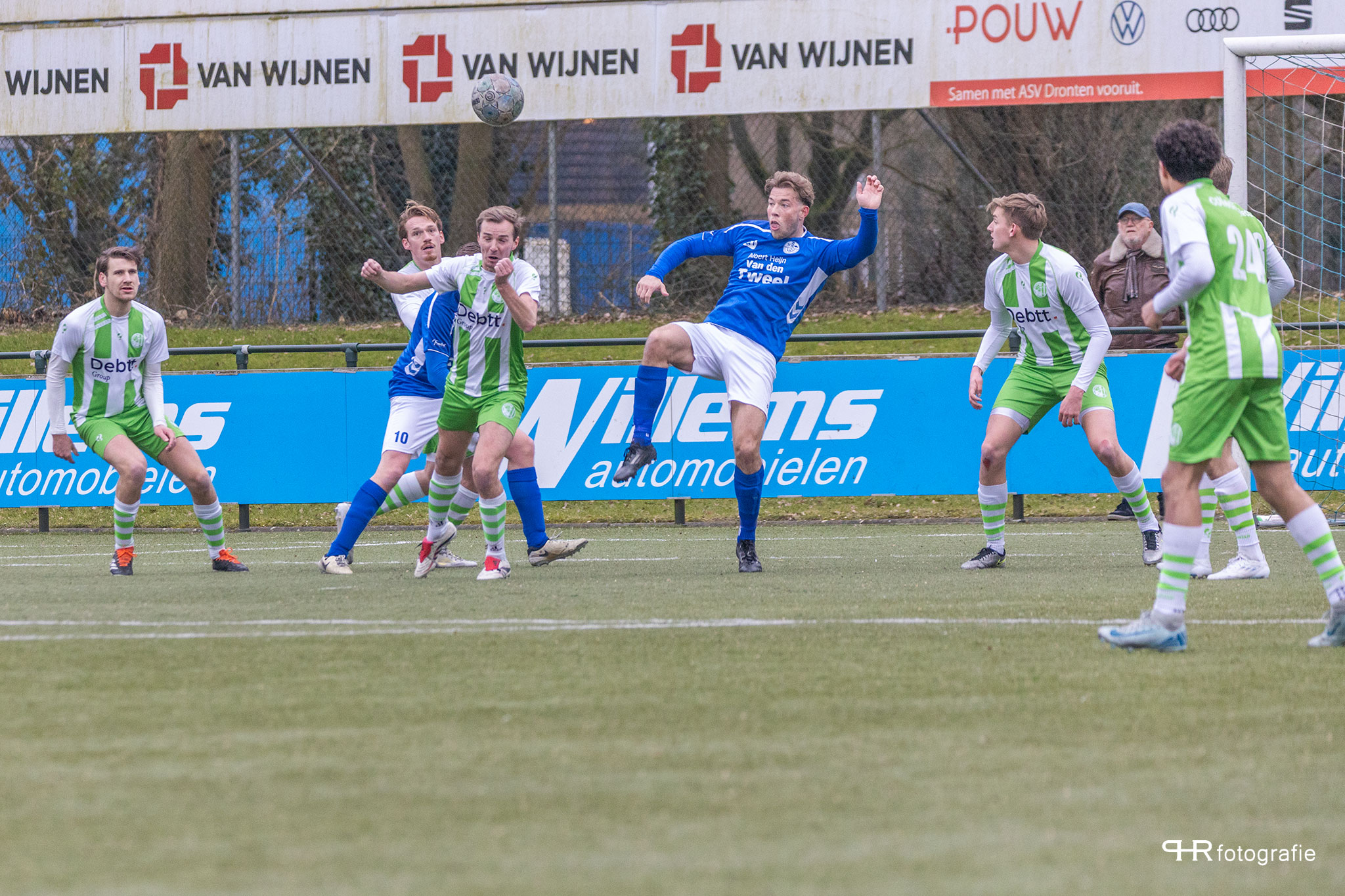 Hierbij deden de broertjes Breukelman een wedstrijdje: wie kan de bal het verste wegschieten, wat af en toe even voor lucht zorgde in de Dronter verdediging.