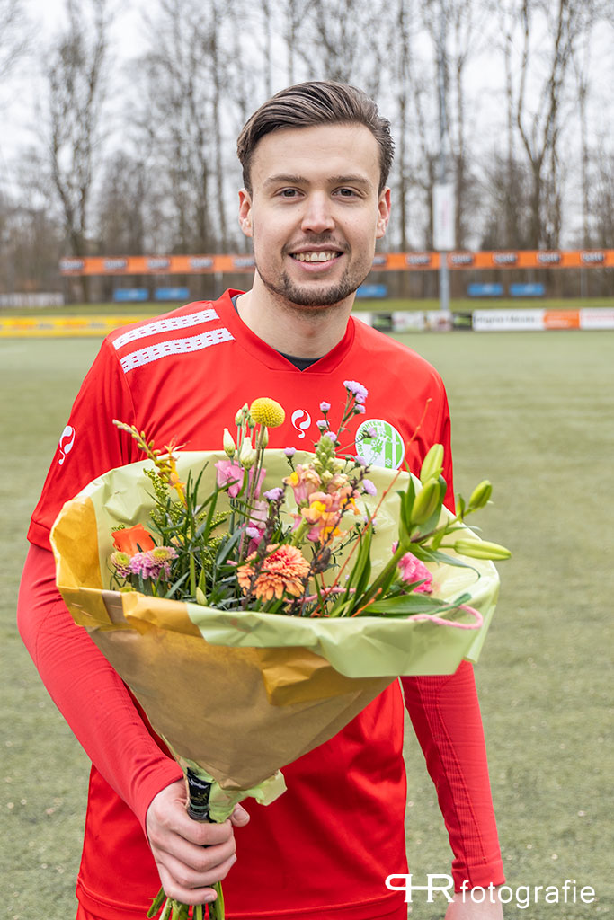 Voor de wedstrijd een mooi moment, waarbij Rèmon Kroes, Pim Breukelman en Nick Siebelink in het ‘zonnetje’ werden gezet: zij kregen bloemen en een oorkonde voor het spelen van 100 wedstrijden in asv Dronten 1.