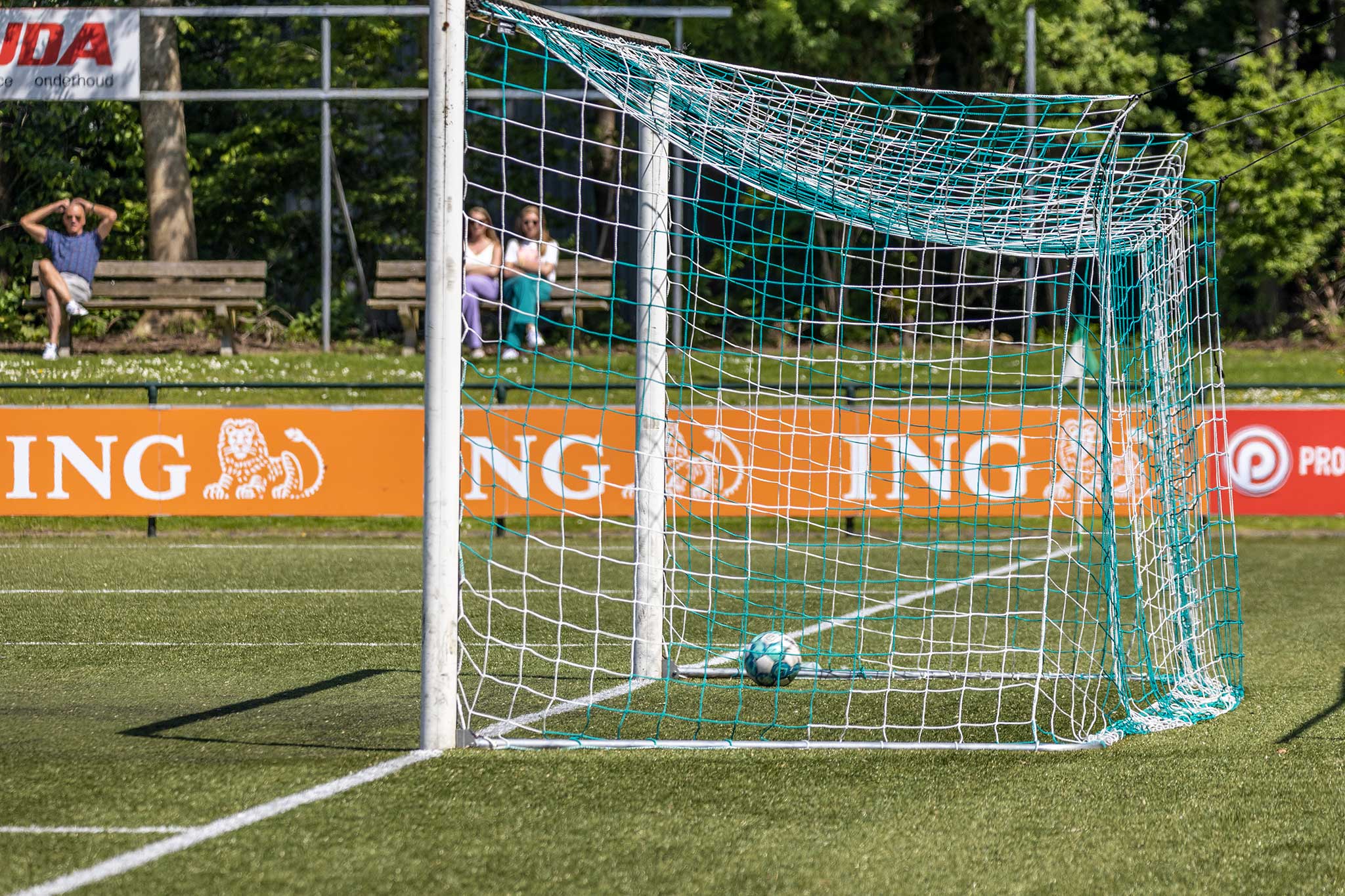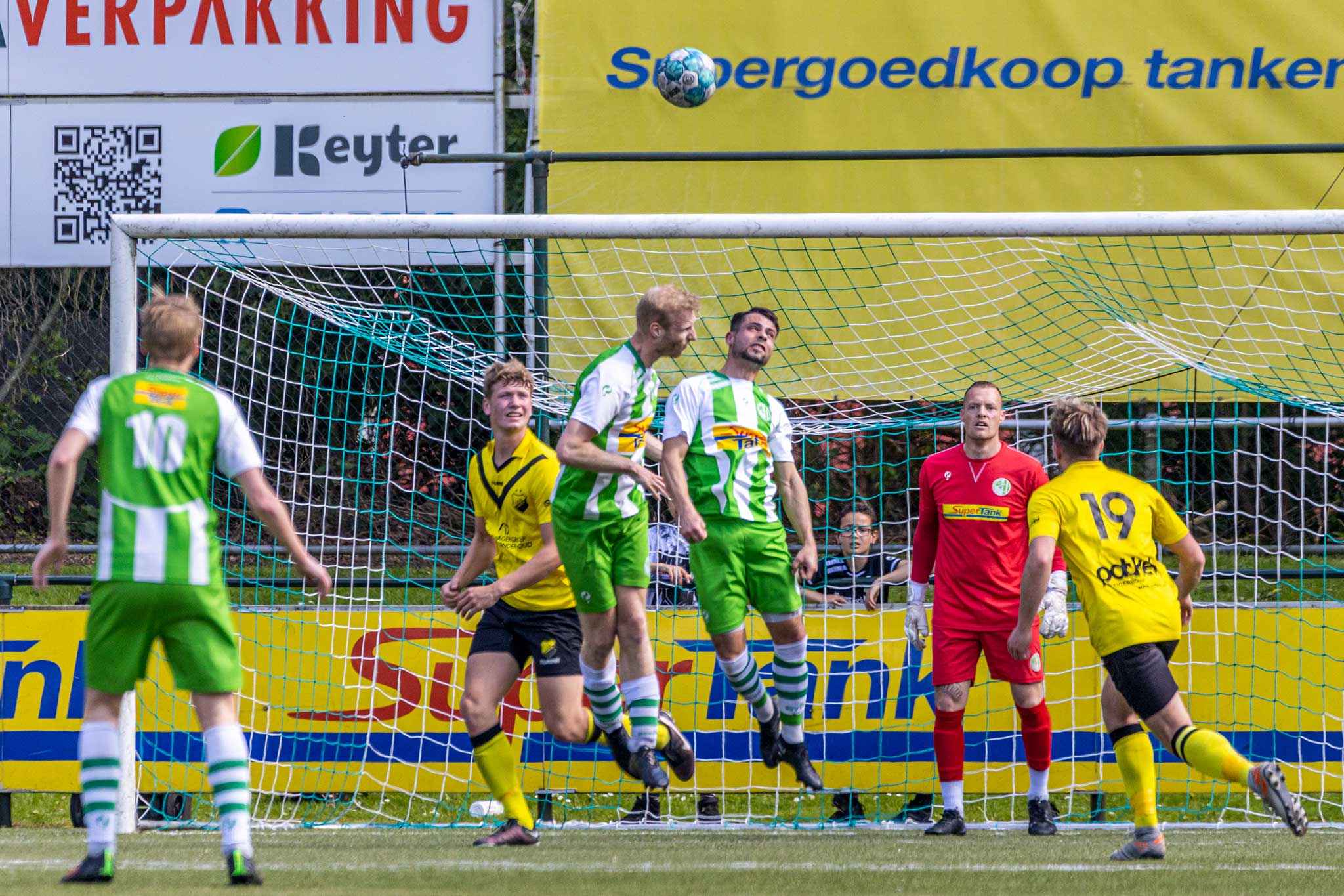 Niet lang hierna een hoge bal die bij de 2e paal belandde en door van der Vlag met een volley richting doel werd geschoten, maar hij raakte slechts het zijnet!