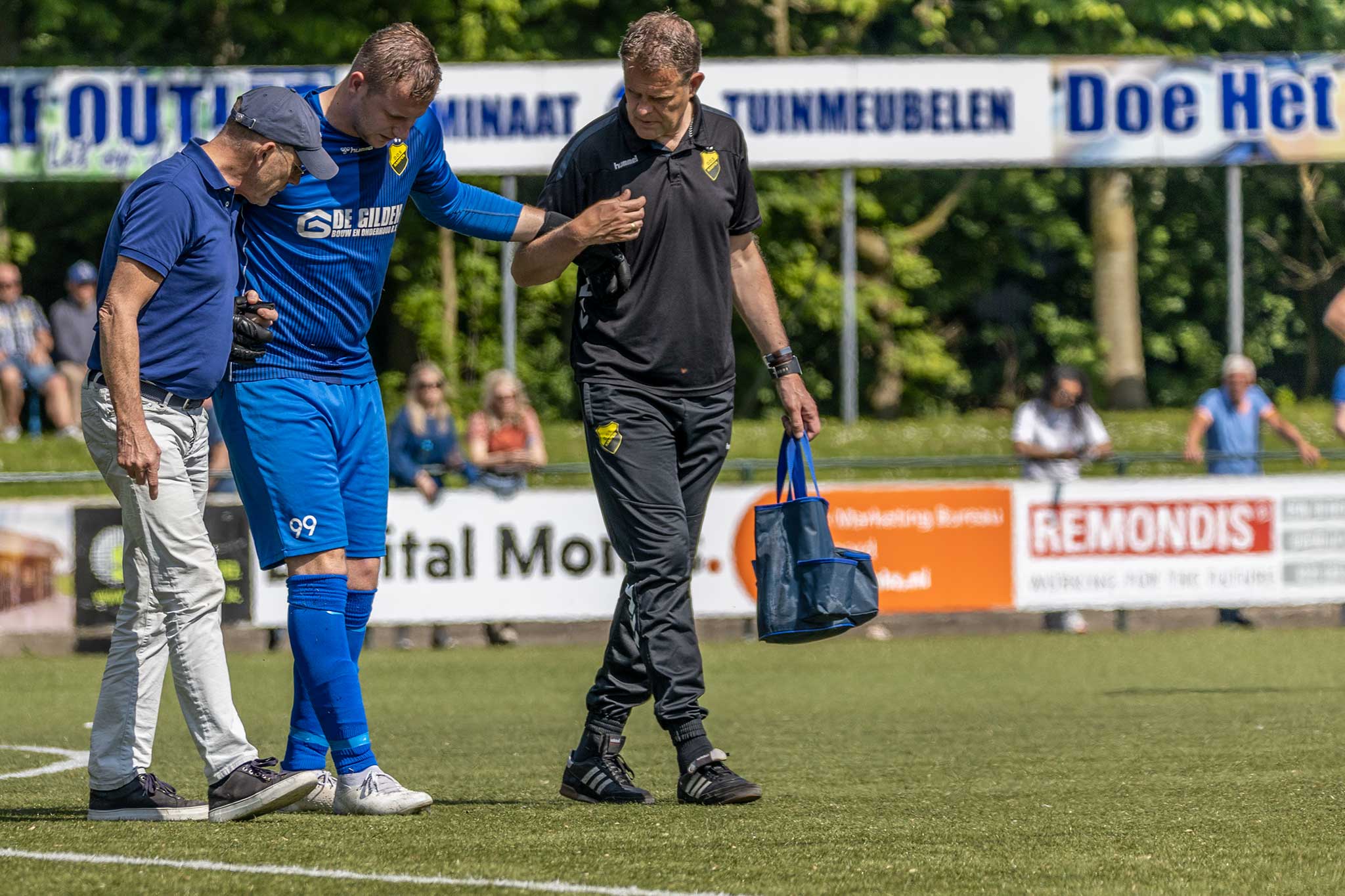 10 minuten later een botsing tussen de keeper en zijn verdedigers. Hij bleef een tijd op de grond liggen, werd behandeld, maar moest de strijd staken.