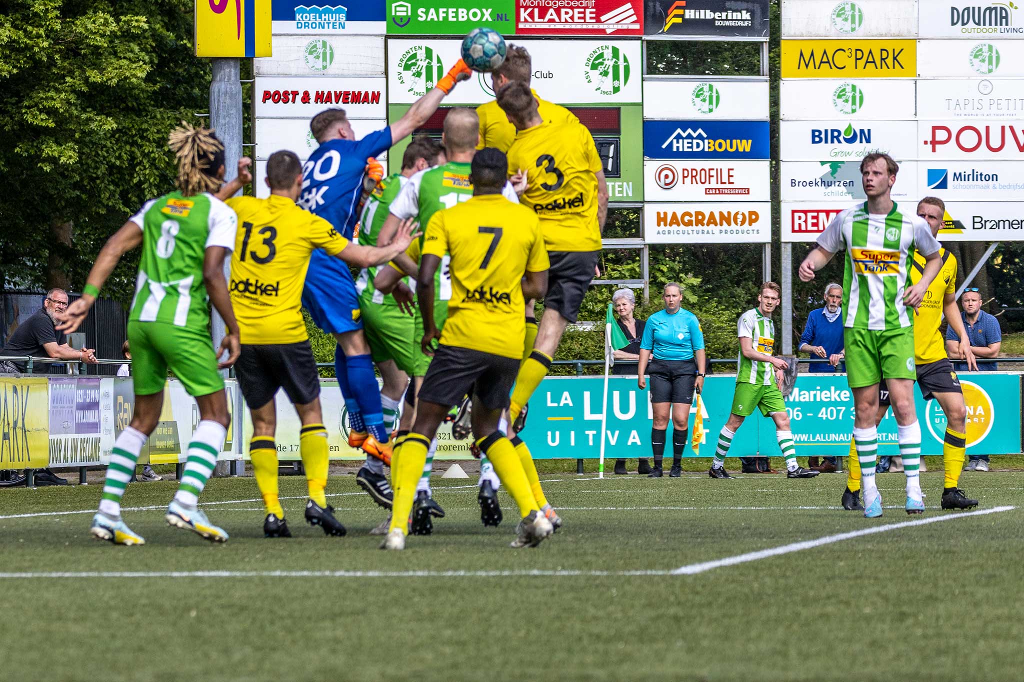 pas in minuut 65 weer wat opwinding. Lucky Akot beging een overtreding op Martijn Timmer, de vrije trap van Kroes leverde vervolgens nietst op. asv Dronten wilde wel, maar tot een grote kans kwam het eigenlijk niet. Van der Vlag was inmiddels vervangen door Rihairo Meulens. Trainer Posthuma zou uiteindelijk 5 wissels doorvoeren, noodzakelijk ook met het warme weer. Breukelman, Bosch, Siebelink en de Boer kwamen het veld in en Veldman, Telgen, Raven en Timmer maakten de 90 minuten niet vol.