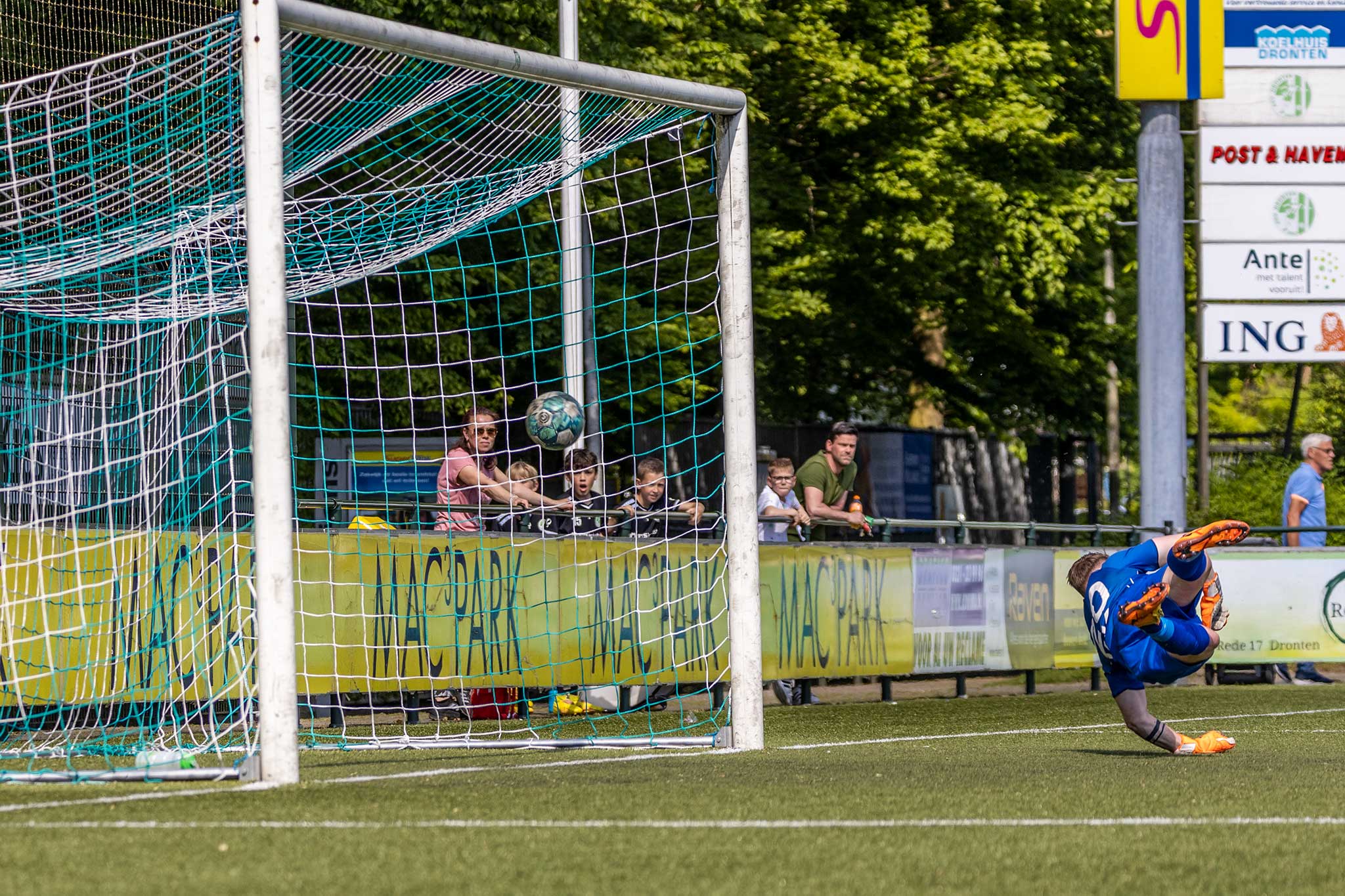 5 minuten voor tijd deed asv Dronten wat het al vaker heeft gedaan, toeslaan in de slotfase. Na een overtreding op zo’n 20 meter van de goal, gaf de scheidsrechter voordeel en leek aanvoerder Schols neergelegd te worden in het strafschopgebied. Waar heel Dronten schreeuwde om een penalty, fluitte de scheidsrechter alsnog voor de overtreding voorafgaand.