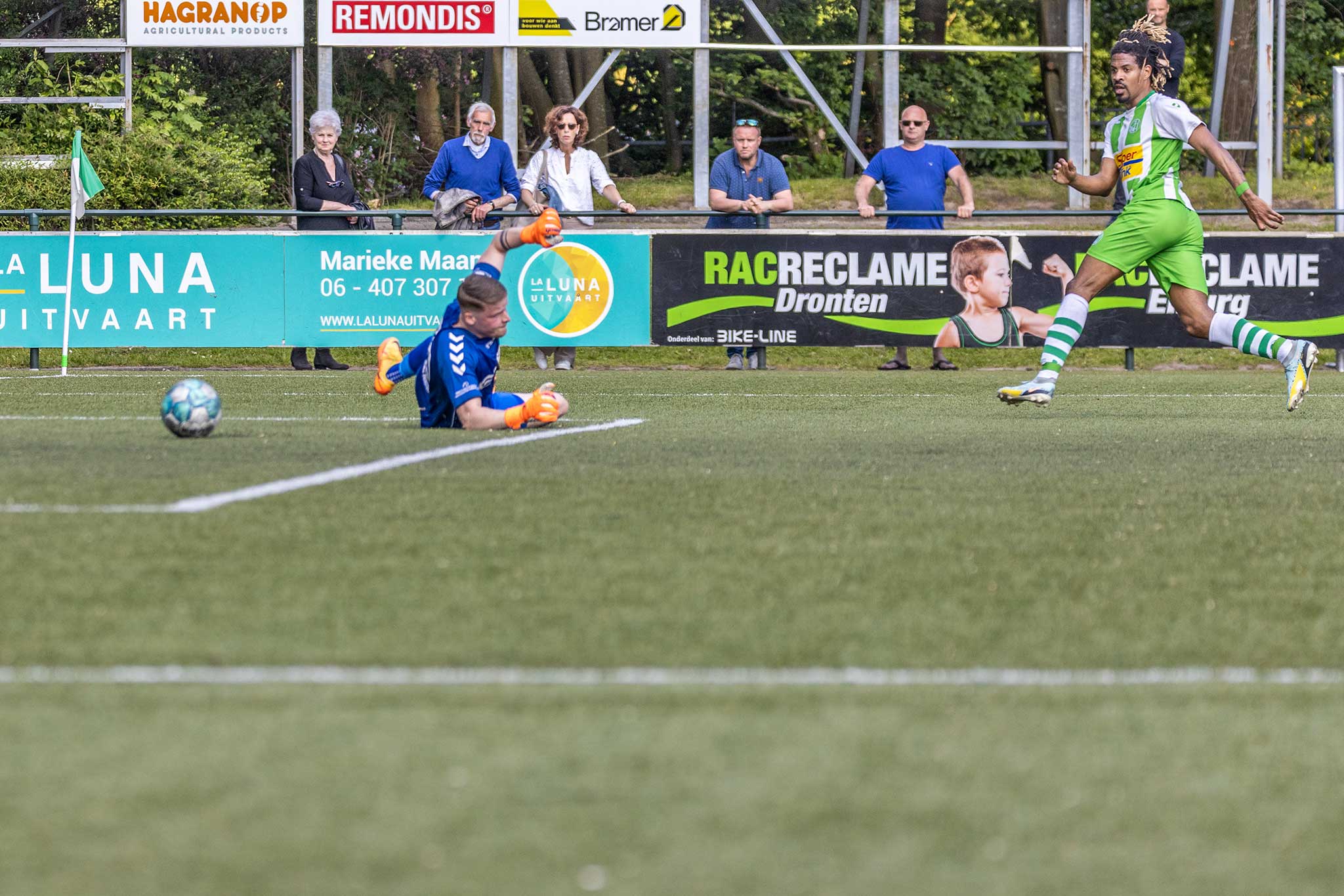 In minuut 88 volgde nog een bal op de lat boven Bindenga, maar er was al gefloten voor buitenspel en daardoor kwam asv Dronten niet meer in gevaar. Wel had Rihairo Meulens de overwinning nog meer glans kunnen geven, maar tweemaal schoot hij de bal vanaf rechts net naast de verkeerde kant van de paal.
