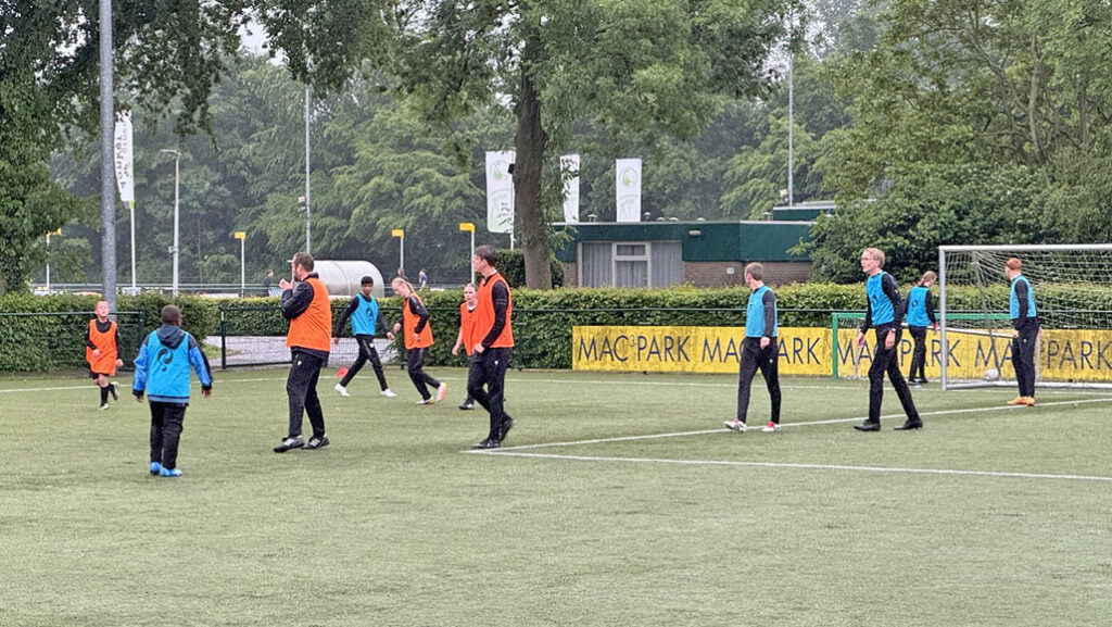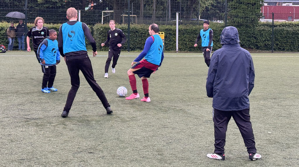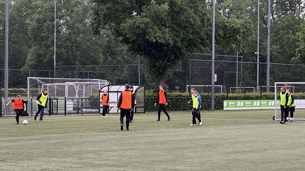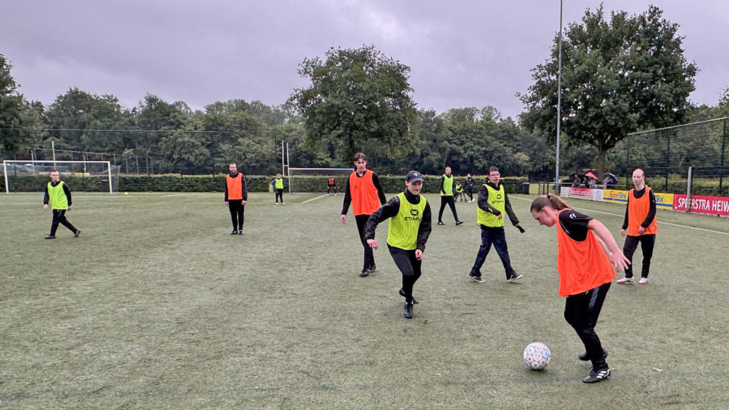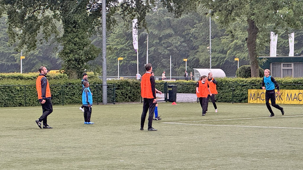Onder de bezielende leiding van de coaches en begeleiders van zowel het G-Team als het eerste elftal, trapte de training af met een klassieke rondo. Terwijl de regen onophoudelijk neerdaalde en het kunstgras steeds sneller maakte, vlogen de ballen vrolijk en met precisie in het rond. Het was het perfecte begin om de spieren goed los te werken. De concentratie was direct zichtbaar, maar al snel klonken ook de eerste lachsalvo’s over het veld, aangemoedigd door het applaus vanaf de zijlijn. De interactie tussen de spelers van het G-Team en de selectiespelers was direct hartverwarmend; een blik, een aanwijzing, een schouderklopje, alles onder het toeziend oog van de trotse coaches die hun teams zagen floreren.