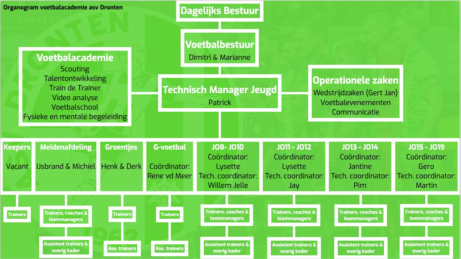 Het organogram moet daarbij duidelijkheid bieden om te weten waar je met je vraag naar toe kan gaan. Betreft het hier om voetbalzaken, dan kunnen deze worden gesteld bij de huidige (hoofd)trainers, technisch coördinatoren of anders de technisch manager jeugd. Voor alle overige vragen kan er contact worden gezocht met de leiders of coördinatoren binnen de betreffende leeftijdsgroep.