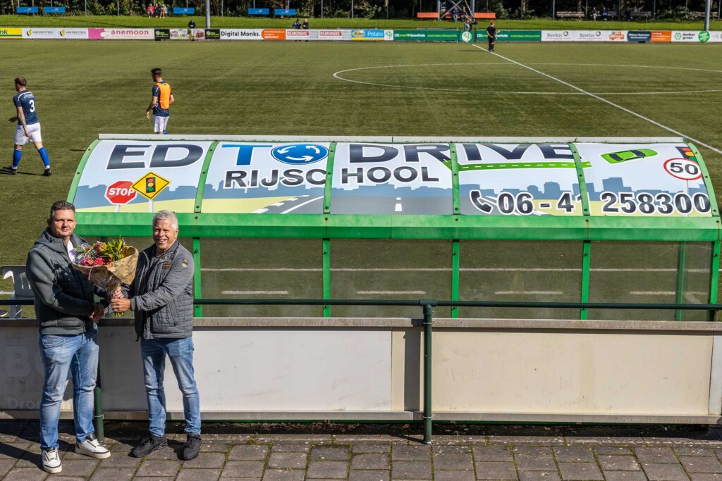 Als eerste werden met pakkende reclame  de dug-outs onthuld met het logo van RIJSCHOOL EDTODRIVE