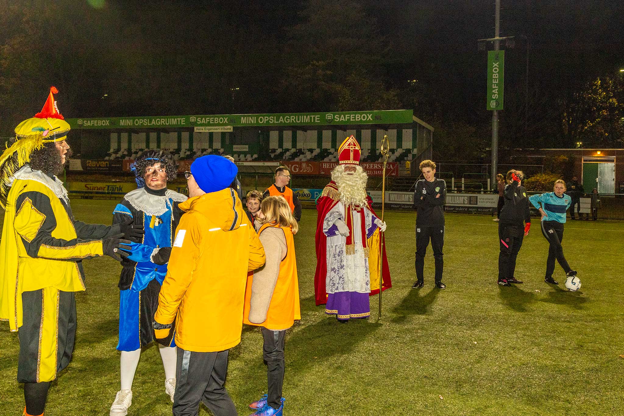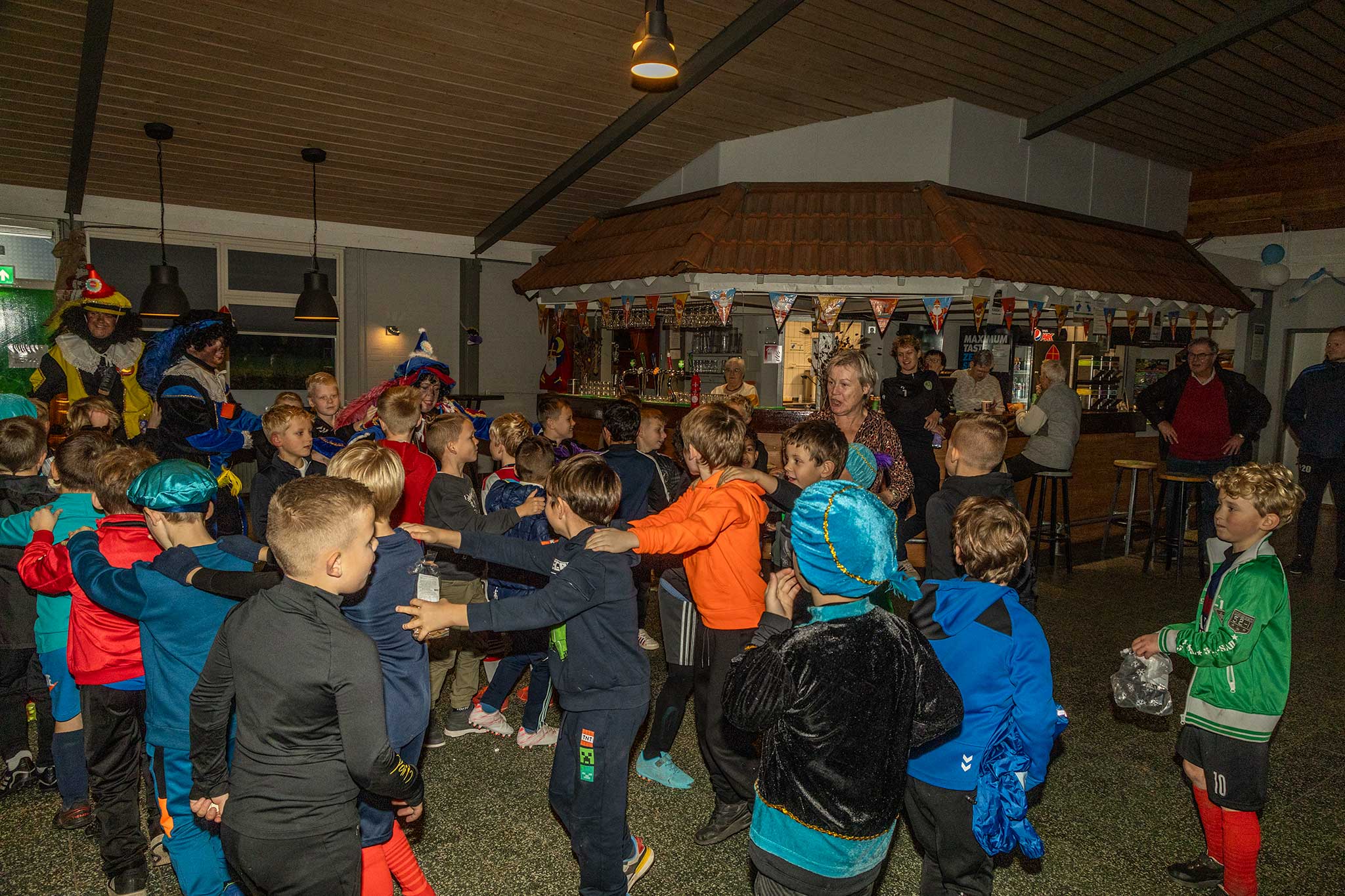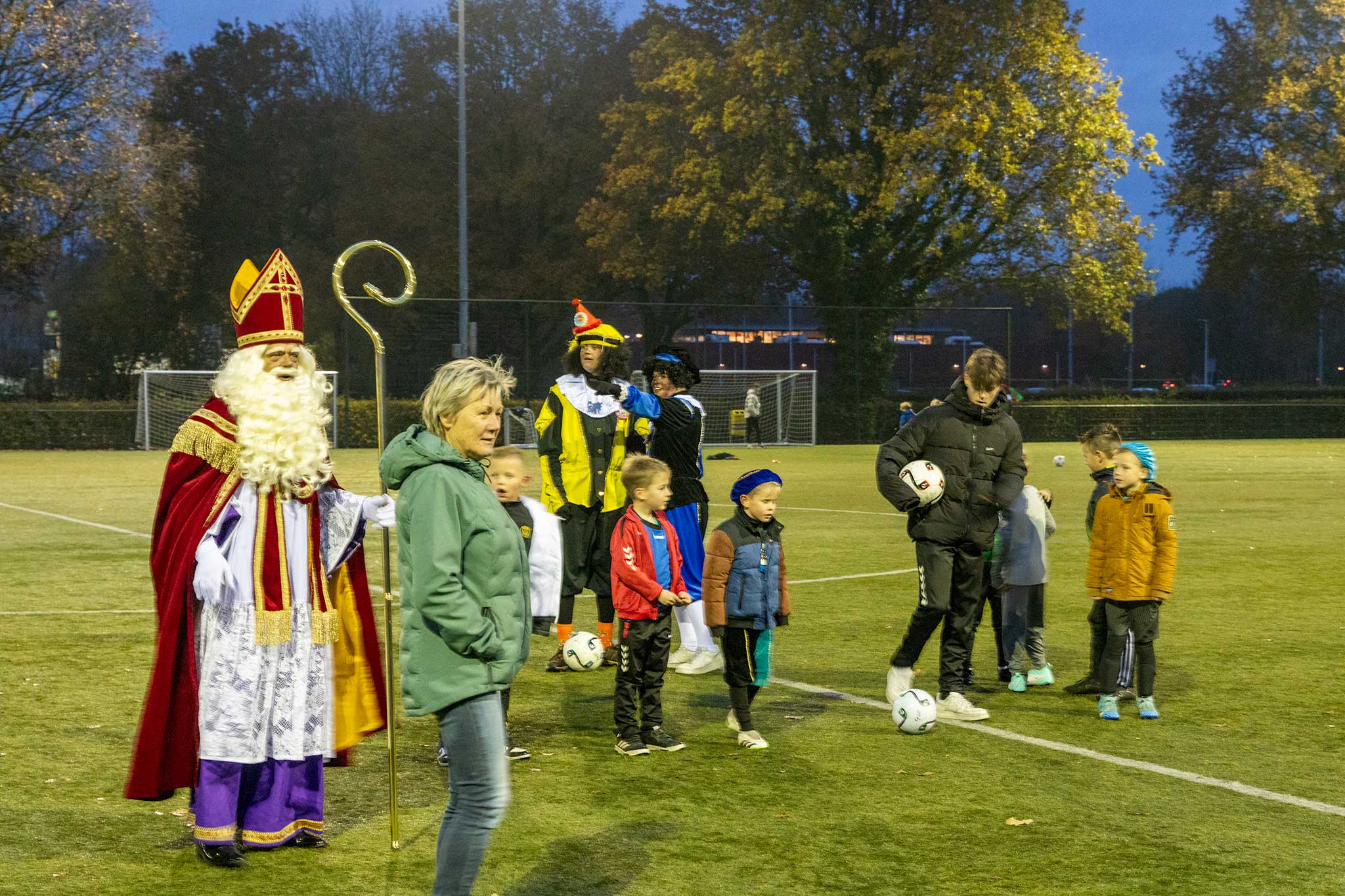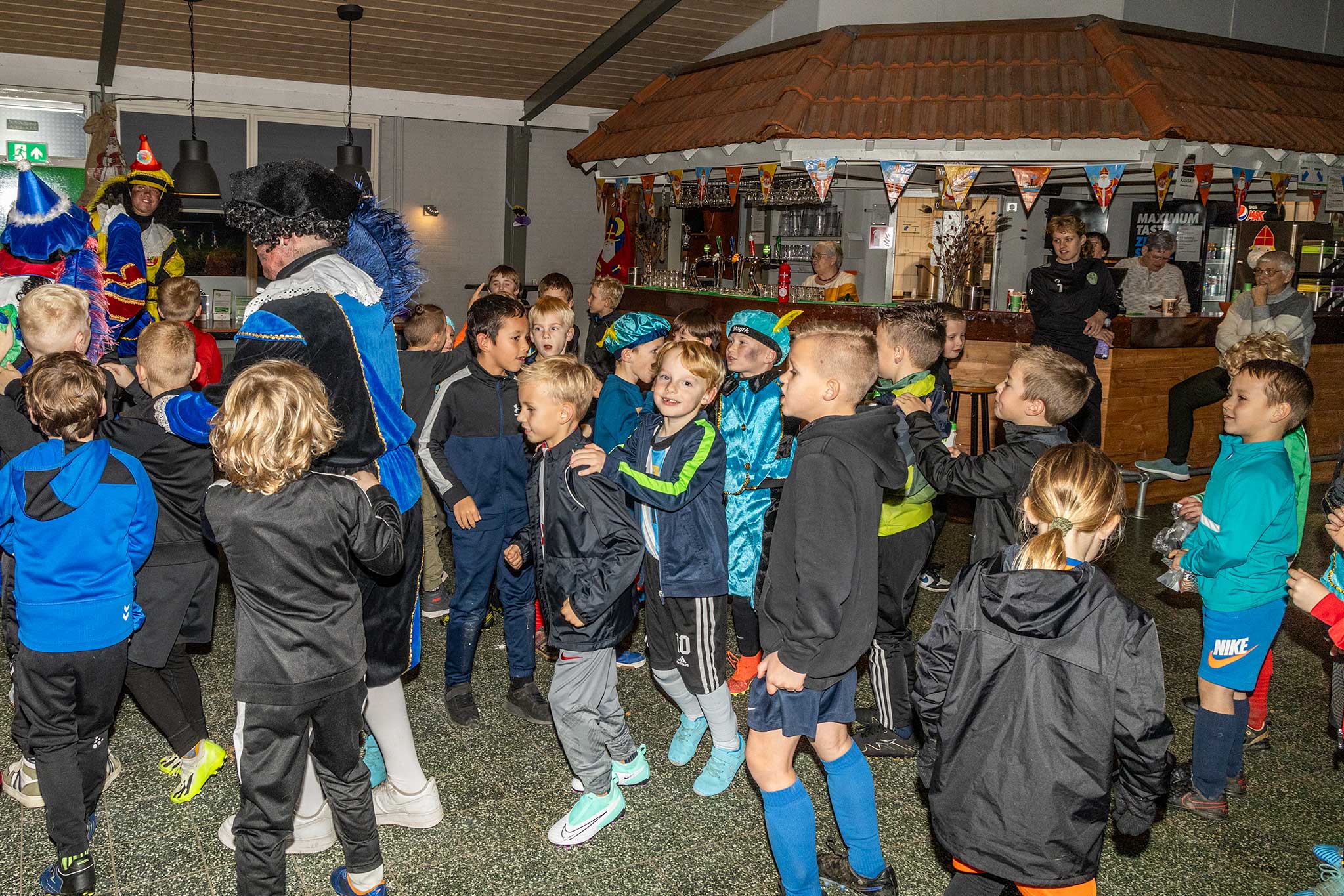Op het veld werden er met de Pieten voetbal spelletjes gedaan en binnen werd iedereen welkom geheten door gastvrouw Jenny Kijk in de Vegte.