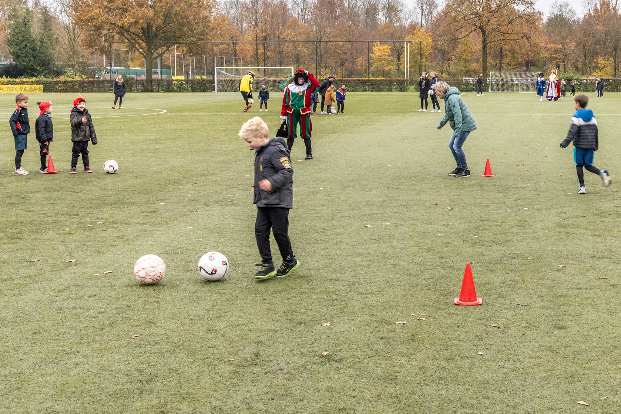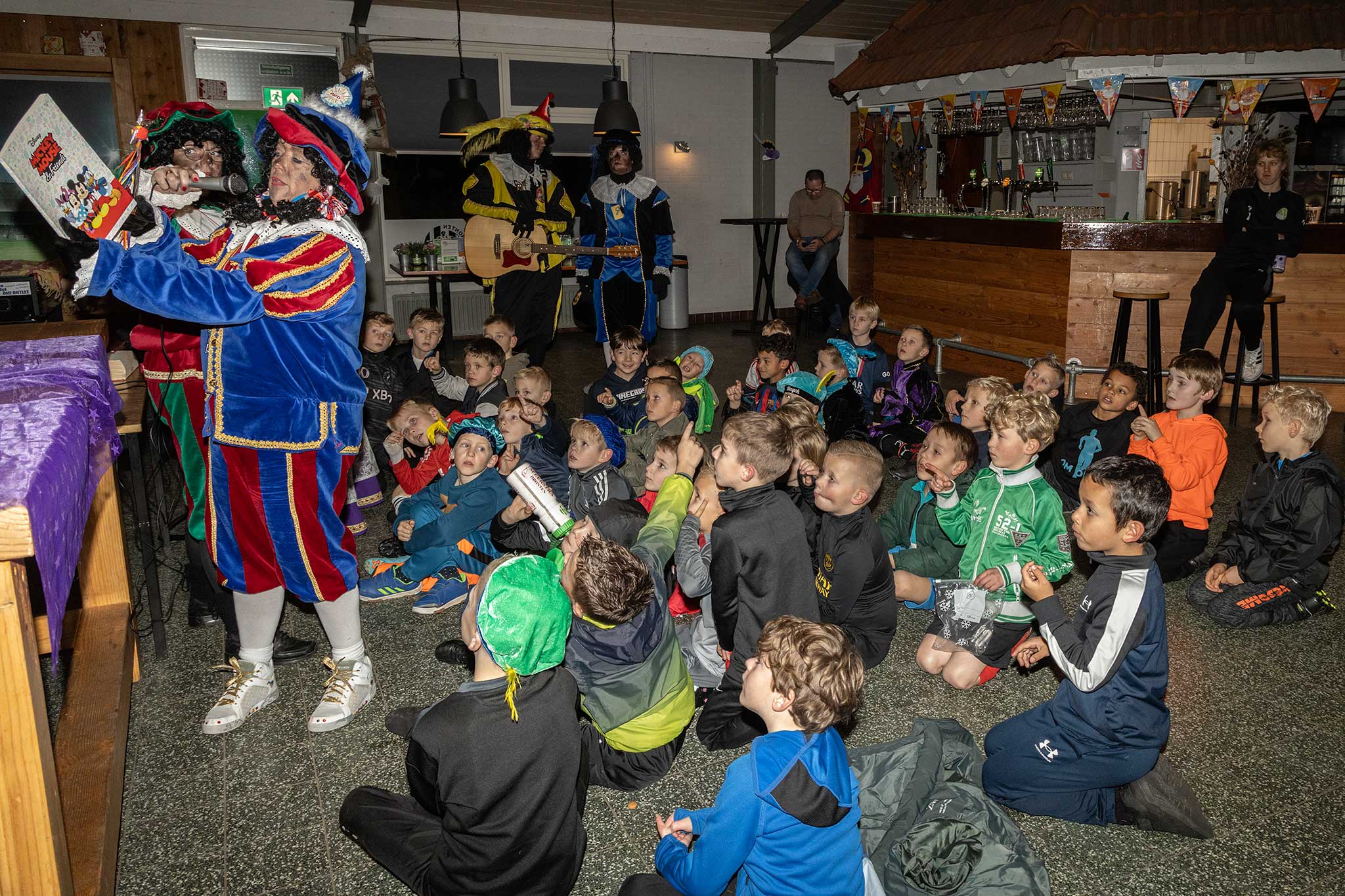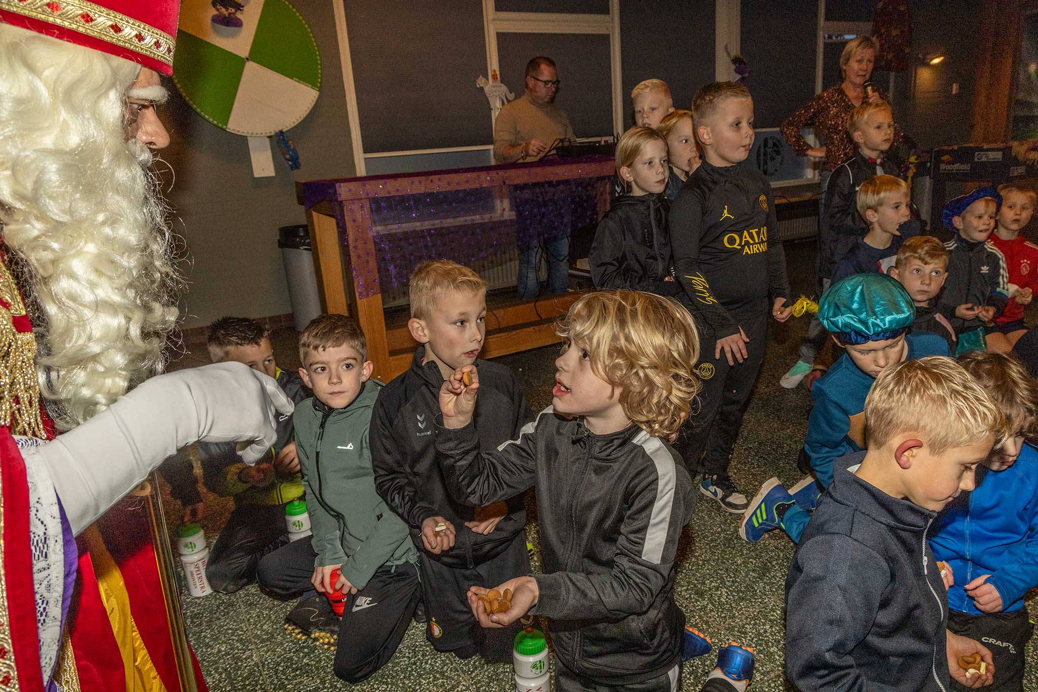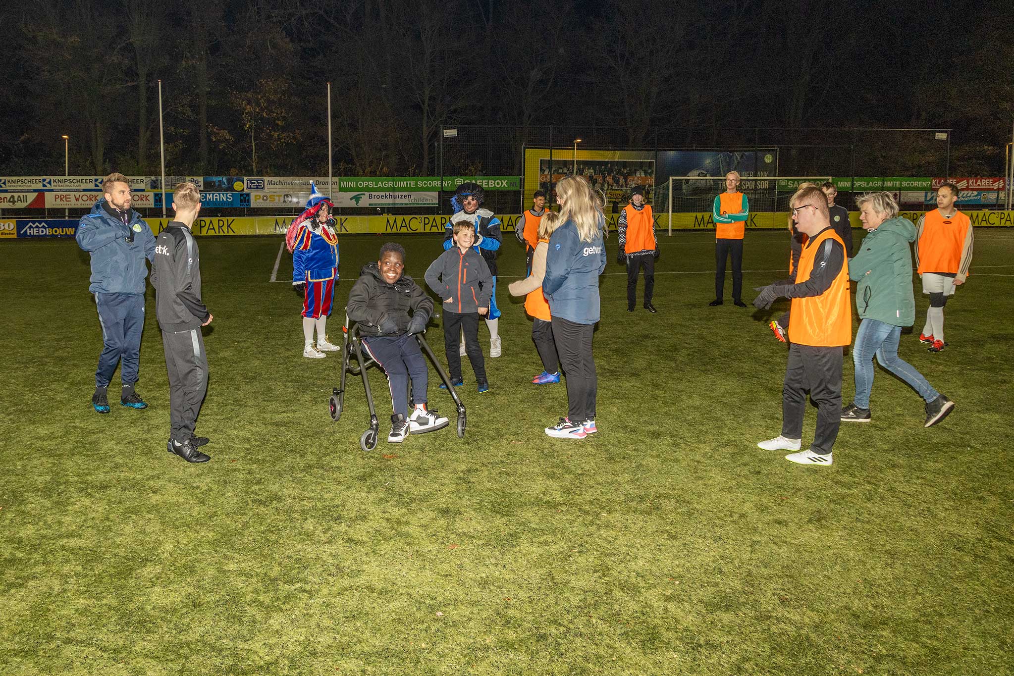 Op het veld werden er met de Pieten voetbal spelletjes gedaan en binnen werd iedereen welkom geheten door gastvrouw Jenny Kijk in de Vegte.