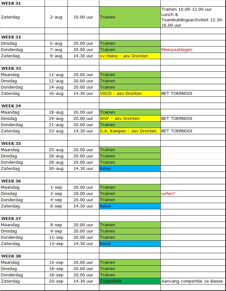 Het vlaggenschip van asv Dronten is dit jaar vroeg begonnen met de voorbereiding op het nieuwe seizoen. Hier is voor gekozen i.v.m. het vertrek van 12 spelers die al dan niet zijn gestopt, lager gaan spelen of zijn overgeschreven naar een andere vereniging.